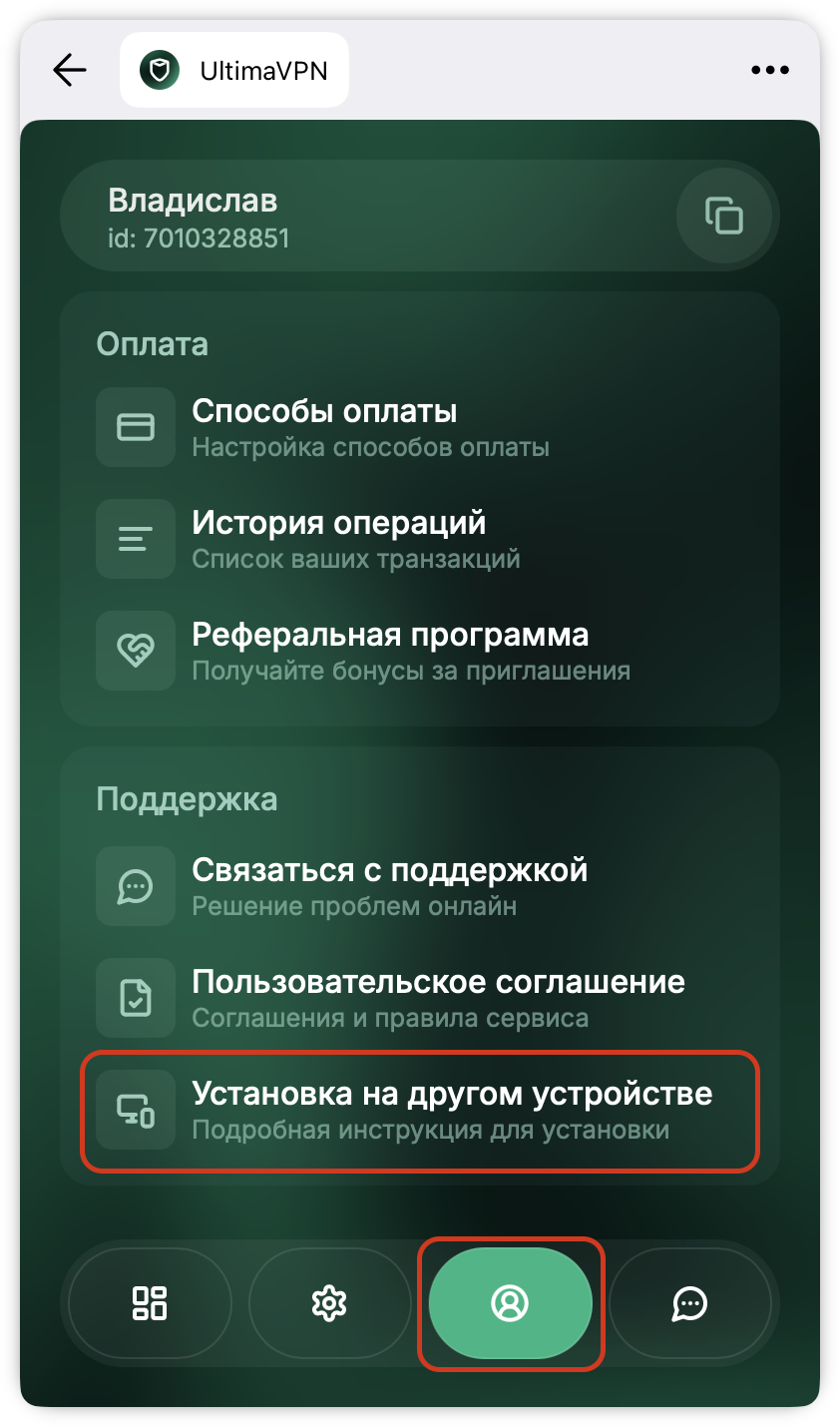 Например, если у вас подписка на два устройства и вы хотите дать доступ другу, просто отправьте ему эту ссылку — он сможет использовать её в своём приложении без входа в бот.