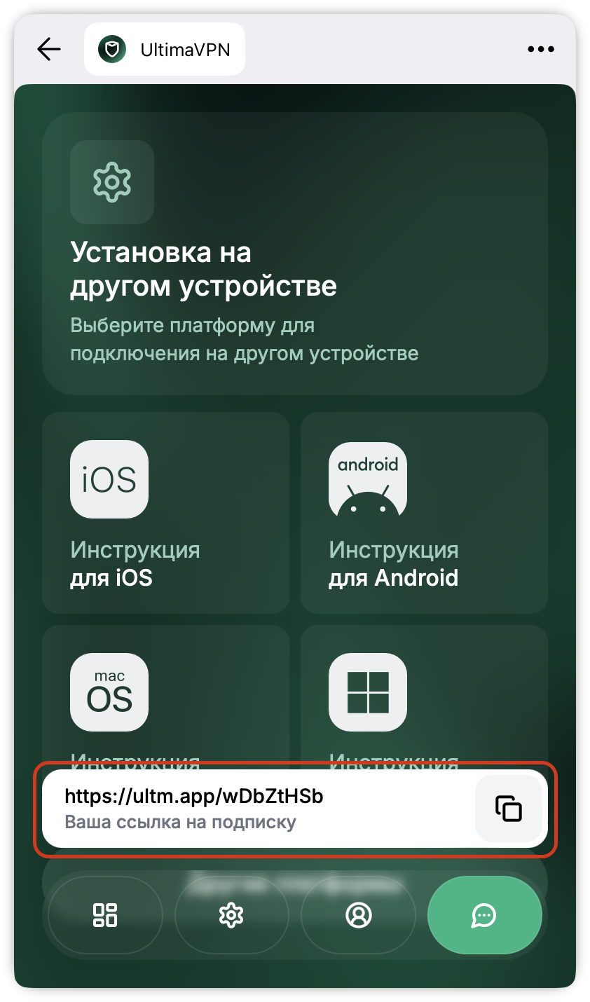 Если вы хотите подключить дополнительное устройство к вашей общей подписке, скопируйте ссылку на подписку из профиля (по инструкции выше) и вставьте её в приложение на другом устройстве.